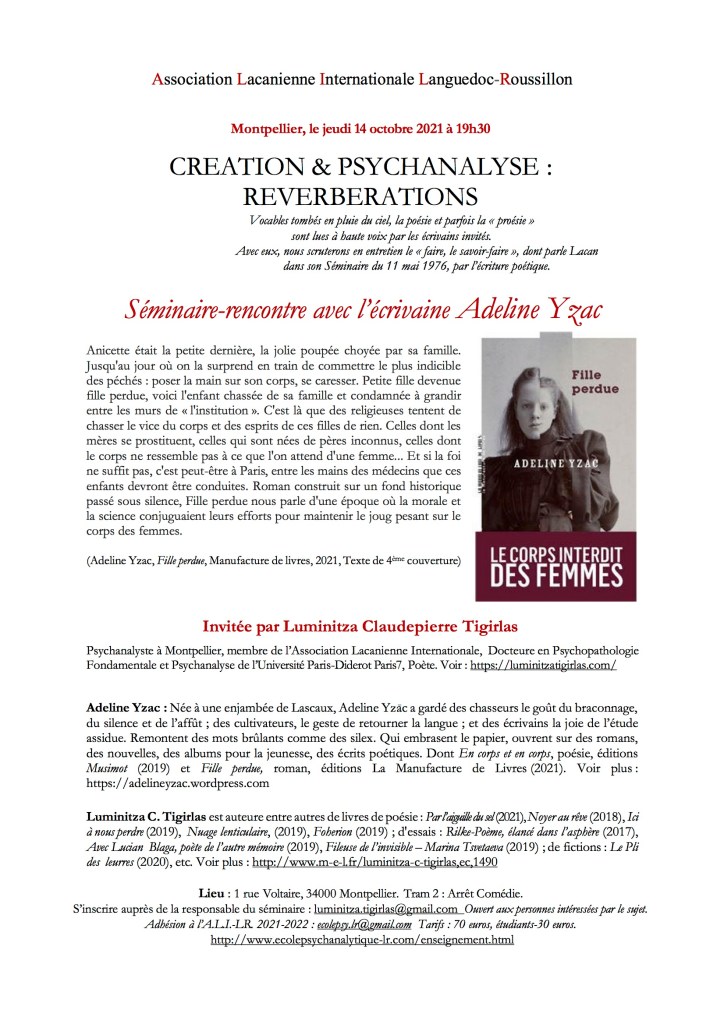 Création&Psychanalyse: réverbérations le 14 octobre 2021 avec l’écrivaine Adeline Yzac Publié le 1 juillet 2021 par Luminitza CLAUDEPIERRE TIGIRLAS L’événement est annoncé sur le site de l’Association Lacanienne Internationale: https://www.freud-lacan.com/agenda/detailevenement/4041/-/creation-psychanalyse-reverberations-seminaire-rencontre-avec-l-ecrivaine-adeline-yzac