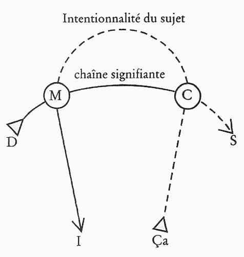La ligne représentative de la chaîne signifiante est recoupée d’avant en arrière par une ligne pointillée qui représente le niveau de la simultanéité des signifiants. Lacan note par un C le point de rencontre du code. ( …à suivre)