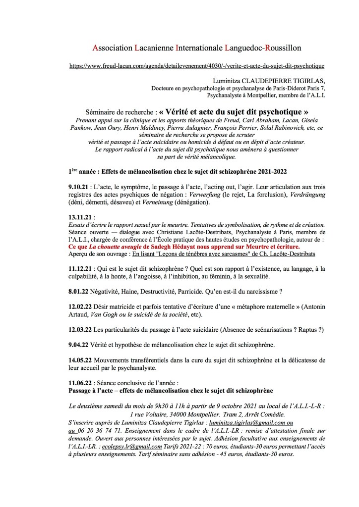 Séminaire de recherche : « Vérité et acte du sujet dit psychotique »